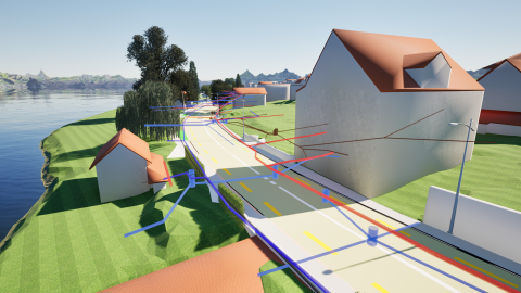 Bruchkanten und Strassenabschlüsse wurden für die detaillierte Modellierung des Strassenkörpers mittels Punktwolke und infra3D Strassenbildern digitalisiert. Die Möglichkeit, dabei einzelne Digitalisierungen direkt in infra3D vorzunehmen, bietet maximale Flexibilität im Arbeitsablauf. Der kontinuierliche Abgleich mit der digitalen Strasse ermöglicht es, alle Details der Bauteile wie Position, Form oder Oberflächenbeschaffenheit exakt zu ermitteln und im Modell wahrheitsgetreu umzusetzen. Der Abgleich zwischen Modellierung und Punktwolke gewährleistet eine optimale Qualitätssicherung des gesamten Modells. Zudem zeigt infra3D die genaue Lage und Höhe der Schachtdeckel verschiedener Gewerke, sodass deren Position einfach überprüft werden kann. Die Mehrheit der Daten für die Werkleitungsmodellierung wurden aus den vorhandenen Werkleitungskatastern bezogen. Mit der Integration der 3D-Gebäude von SwissBuildings3D wurde das Modell zusätzlich angereichert. Der Informationsgehalt der Bauteile wurde auf die Anforderungen des Auftraggebers ausgerichtet, sodass das Modell eine verlässliche Grundlage für eine effiziente und optimale Planung, Projektierung und Ausführung bietet. Zusätzlich liefert das digitale Bestandsmodell wertvolle Informationen für die zukünftige Bewirtschaftung und den Unterhalt der Strasseninfrastruktur.