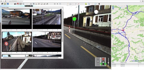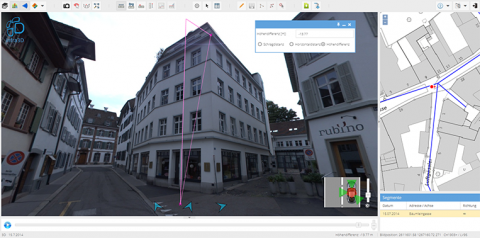 - Virtuelle Begehung / Navigation: Bildsequenzen entlang der Befahrungsrouten sind wie in einem Video-Player abspielbar. Mit der Wahl einer der verschiedenen Kameras wählen Sie die gewünschte optimale Ansicht. Bei Kreuzungen steht Ihnen eine intuitive Richtungswahl zur Verfügung. Sind verschiedene Zeitstände erfasst, ist der Wechsel in «vergangene Zeiten» nur ein Klick entfernt. Über die Kartenansicht ist das befahrene Netz dargestellt und ein Sprung direkt an jede beliebige Stelle ist möglich. Der hinterlegte Kartendienst kann kundenspezifisch festgelegt werden (je nach Verfügbarkeit: Satellitenbilder, Landestopografie-Karten, Katasterpläne oder OpenStreetMap-Karten). Bei einem vorhandenen linearen Bezugssystem (z.B. km-Achse bei Bahnen) wird durch Angabe des Kilometers an die entsprechende Stelle gesprungen.